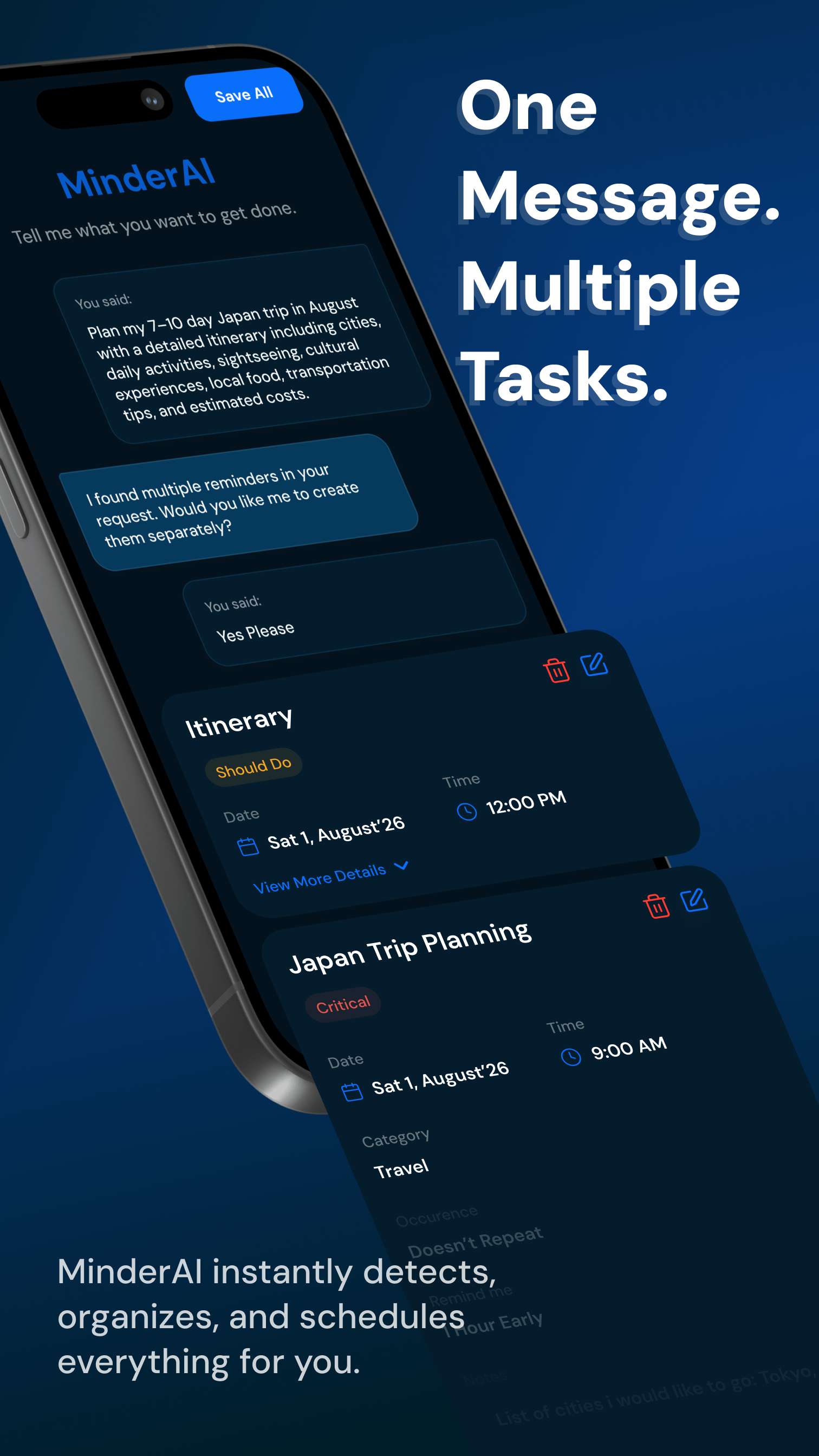MinderAI – One Message. Multiple Tasks. Stop staring at a blank screen. Talk or type to MinderAI, and it instantly detects, organises, and schedules everything for you—breaking down overwhelming requests into actionable plans.