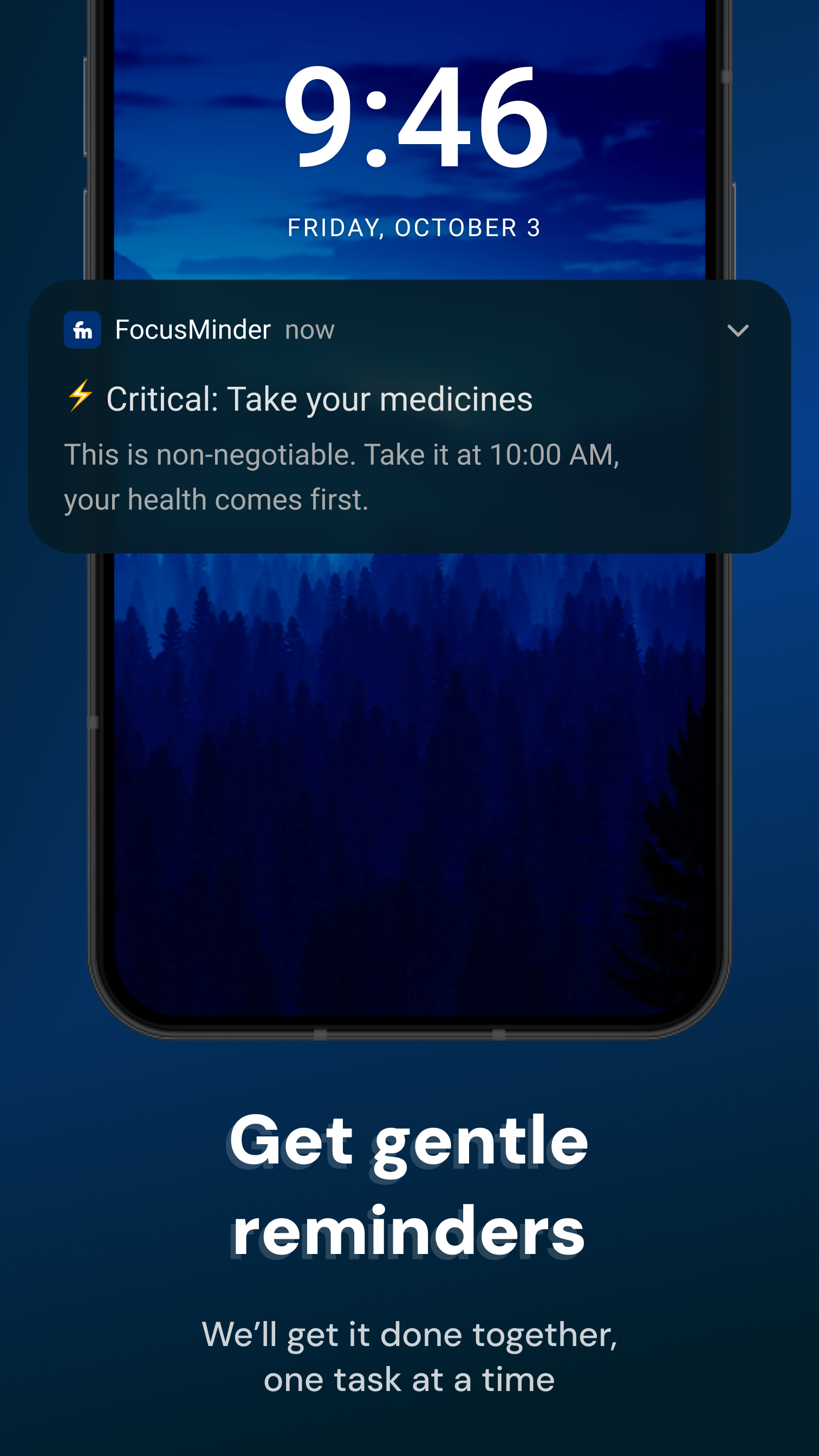 Get Gentle Reminders Watch your progress add up with intelligent notifications. We'll get it done together, one task at a time, with reminders that support your health and focus.